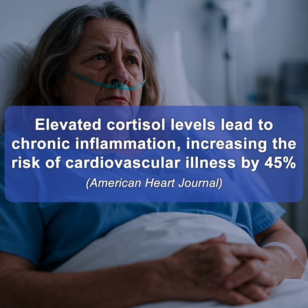 Elevated cortisol levels lead to chronic inflammation, increasing the risk of cardiovascular illness by 45% (American Heart Journal).