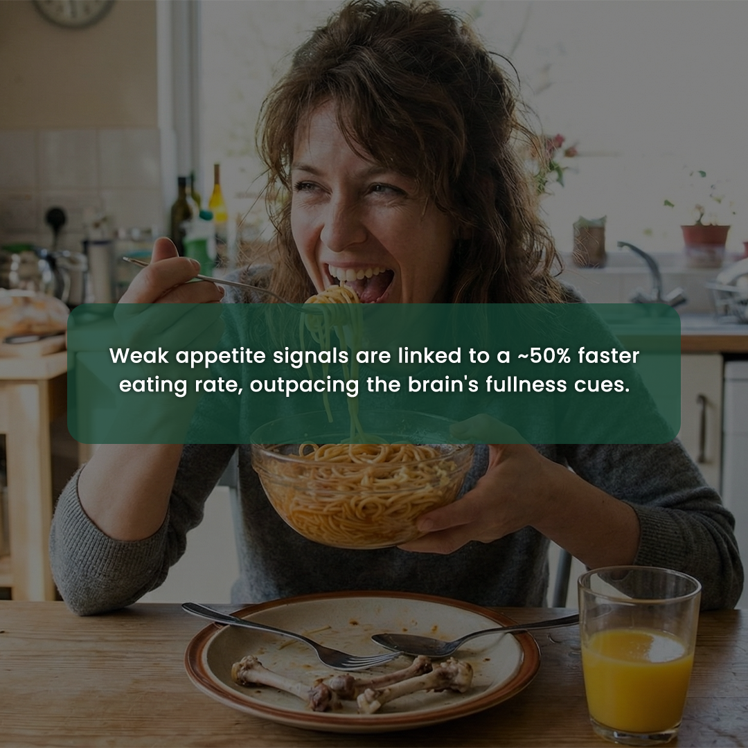 For the appetite that won't quiet and the portions that feel impossible to control. We don't force your body to stop eating—we restore the natural signals that help you feel satisfied sooner, so eating less becomes effortless.