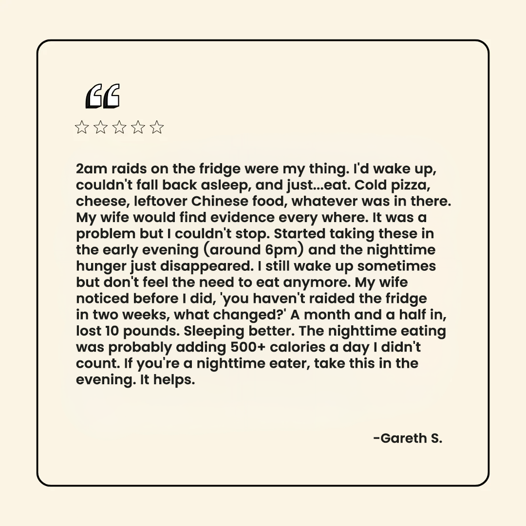 We promise to help you eat less naturally, not fight yourself. Our formula supports satiety signals, reduces cravings, and restores portion control—without stimulants, nausea, or rebound hunger.