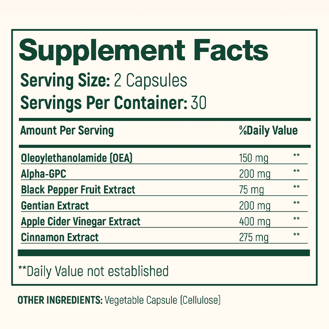 We chose OEA as a precision tool to strengthen your body's natural satiety signals. It's a lipid messenger your body already uses to signal "meal completion." Instead of forcing appetite down artificially, OEA helps you recognize fullness sooner and reduces the frequency and urgency of hunger between meals. This is why you'll naturally feel satisfied with smaller portions without fighting yourself.