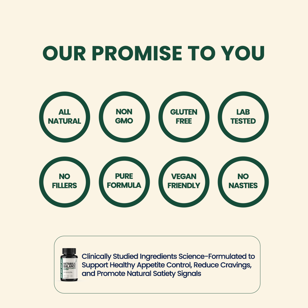 Take your first 2 capsules 20–30 minutes before lunch — when food noise peaks and cravings feel hardest to resist. Metabolic Balance helps support your body's natural "stop eating" signal, so portions feel easier to manage, and you feel satisfied sooner.