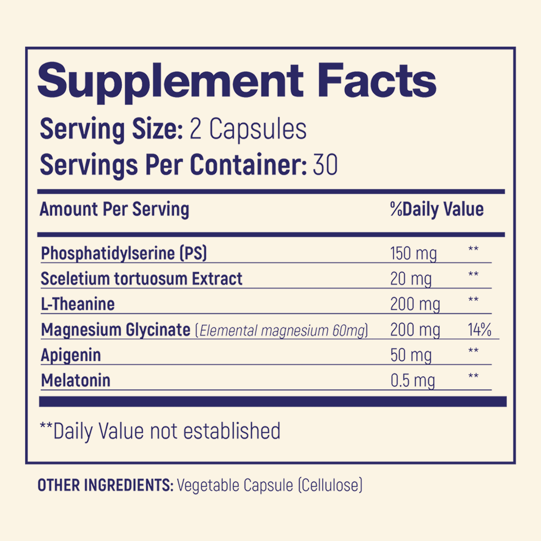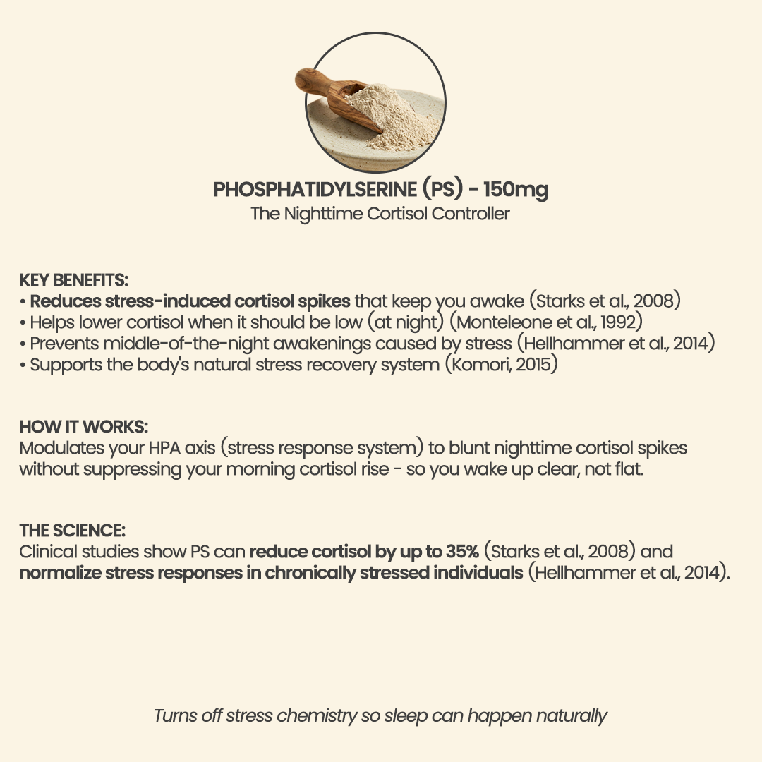 • Phosphatidylserine (PS): 150 mg (actual PS) to help lower nighttime cortisol spikes. We chose PS over Ashwagandha for this nighttime formula because PS is a precision tool that blunts acute, stress-induced cortisol spikes without suppressing your baseline levels. While Ashwagandha is excellent for daytime resilience, taking it at night can lead to next-day grogginess or "emotional flattening". PS helps cortisol drop when it's supposed to, preserving your natural morning cortisol rise so you wake up feeling clear and motivated.