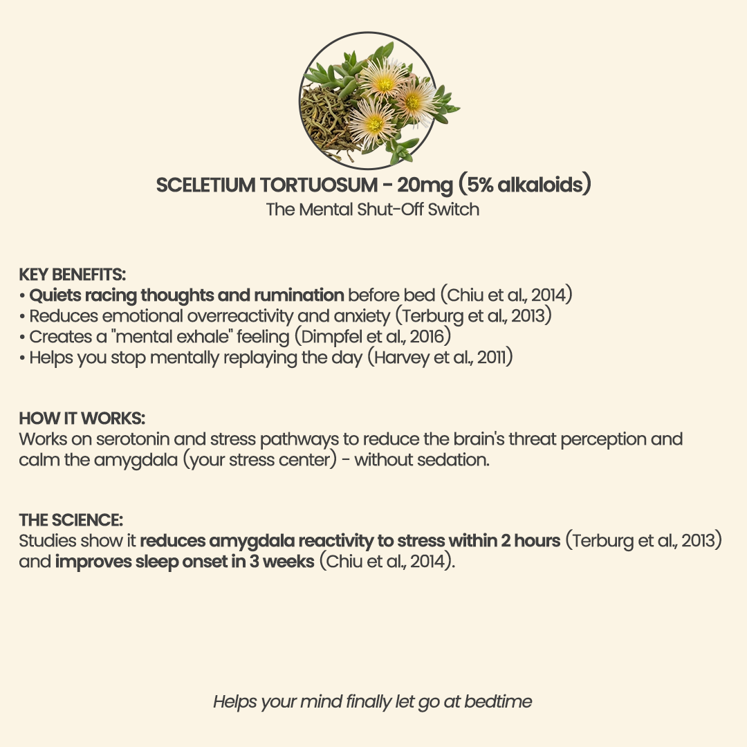 • We selected this specific botanical because it targets the "mental marathon." While other herbs focus on the body, Sceletium works on the brain’s "threat center" (the amygdala) to stop the cycle of nighttime dread.