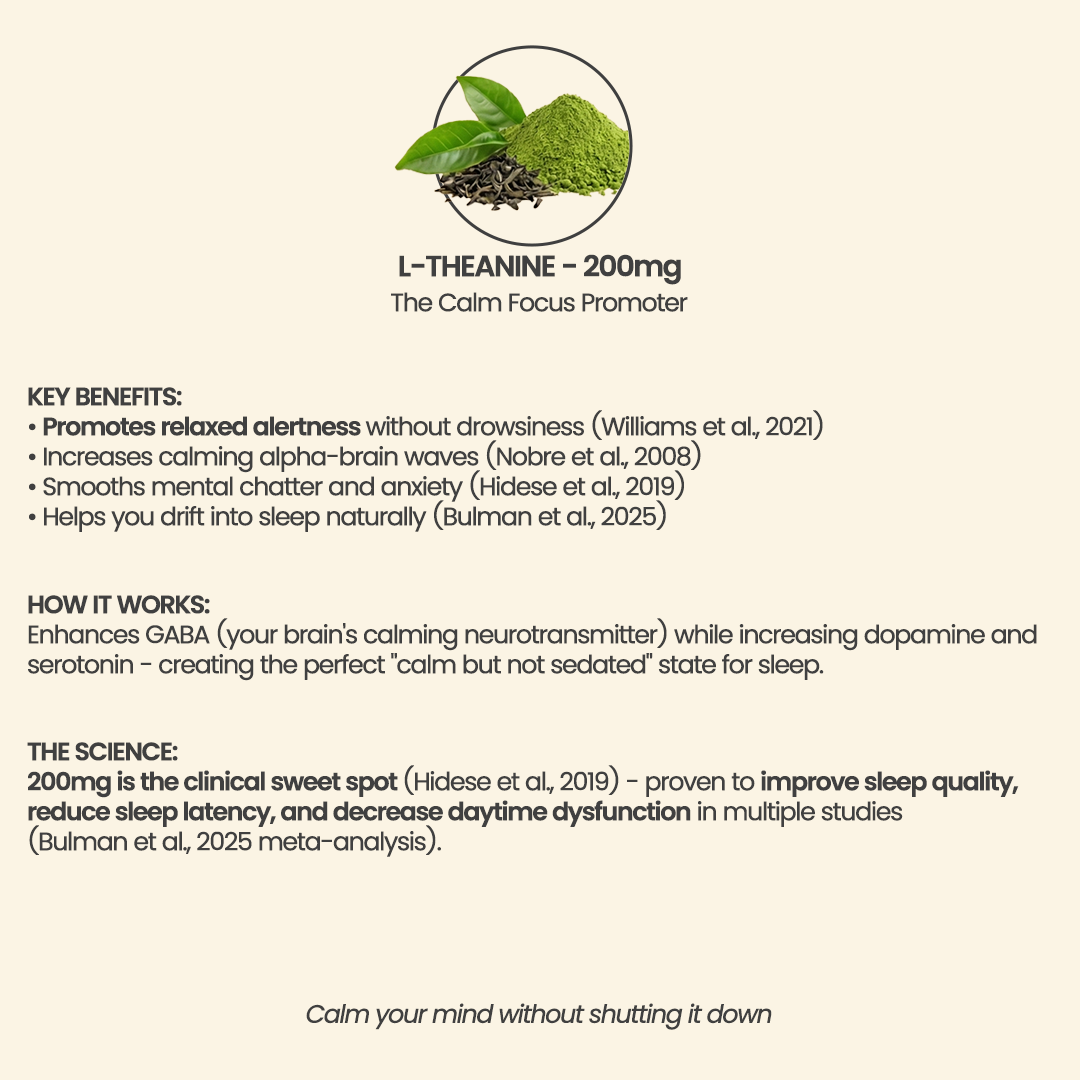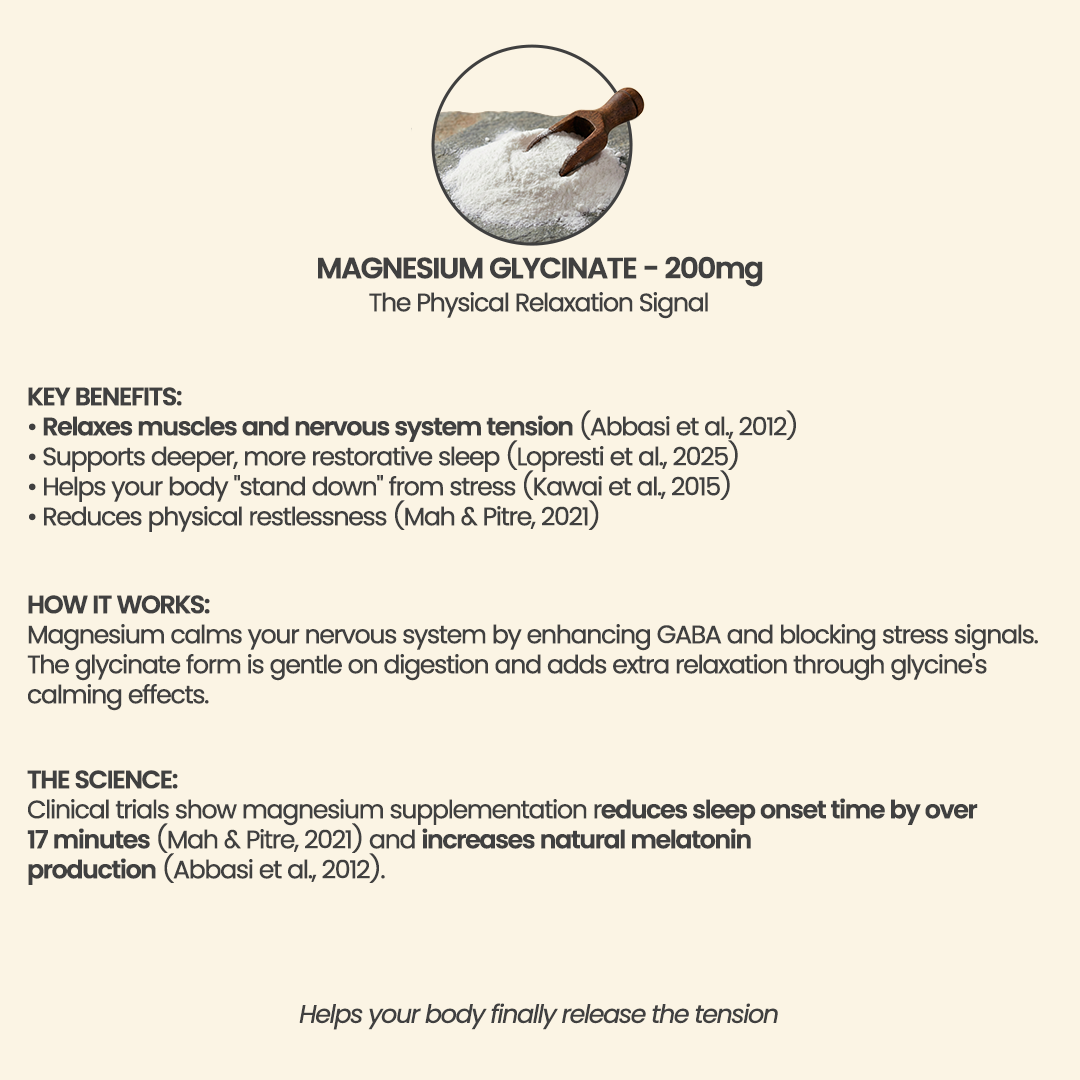 Magnesium Glycinate - 200 mg: We used the glycinate form because it is gentle on digestion and highly effective at activating the parasympathetic "rest-and-digest" system . It helps by physically unclenching tight muscles and jaw tension that can prevent deep relaxation.