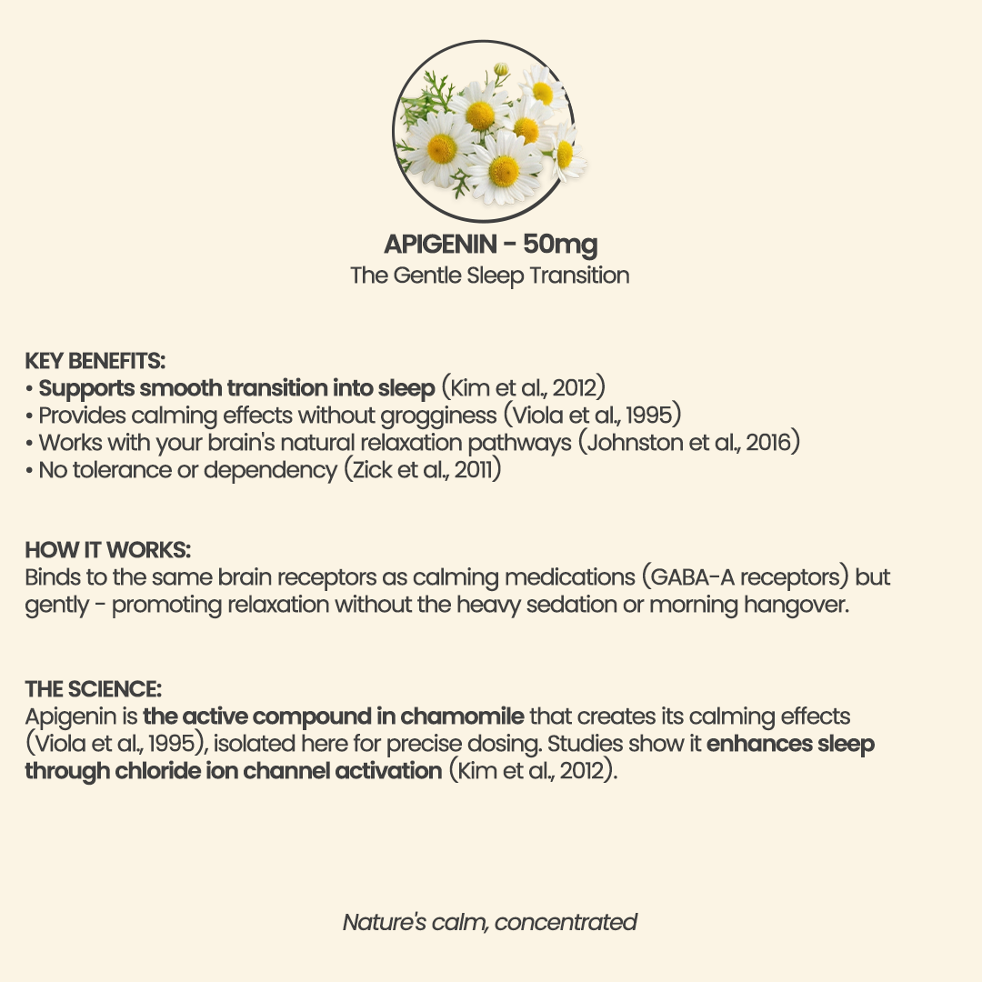 • Apigenin: 50 mg to support sleep-onset smoothing without the risk of dependency.