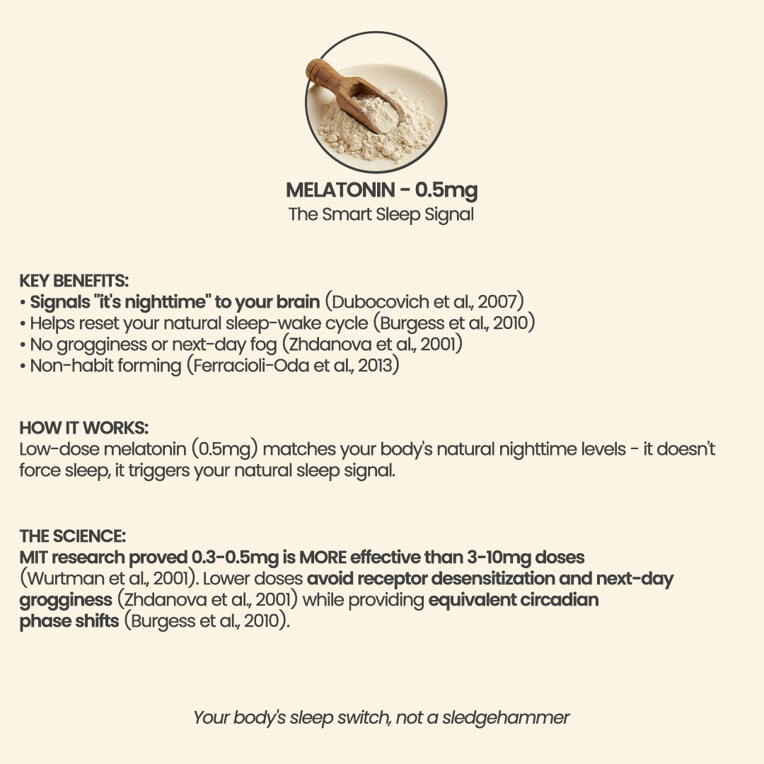 • Melatonin: 0.5 mg to provide a physiological sleep signal rather than forcing sedation. We chose this low dose over higher dosages (like 3 mg or 5 mg) because melatonin is a timing hormone, not a sledgehammer. High doses can desensitize your receptors, fragment deep sleep, and cause a "hangover" effect. Our 0.5 mg dose is strong enough to trigger the natural sleep signal while remaining low enough to avoid next-day fog and dependency.