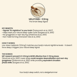 • Stage 3: Trigger the Sleep Signal: Once stress chemistry is down and the nervous system is calm, 0.5 mg of Melatonin acts as a gentle timing signal to tell your brain it is night, rather than forcing sleep through sedation.