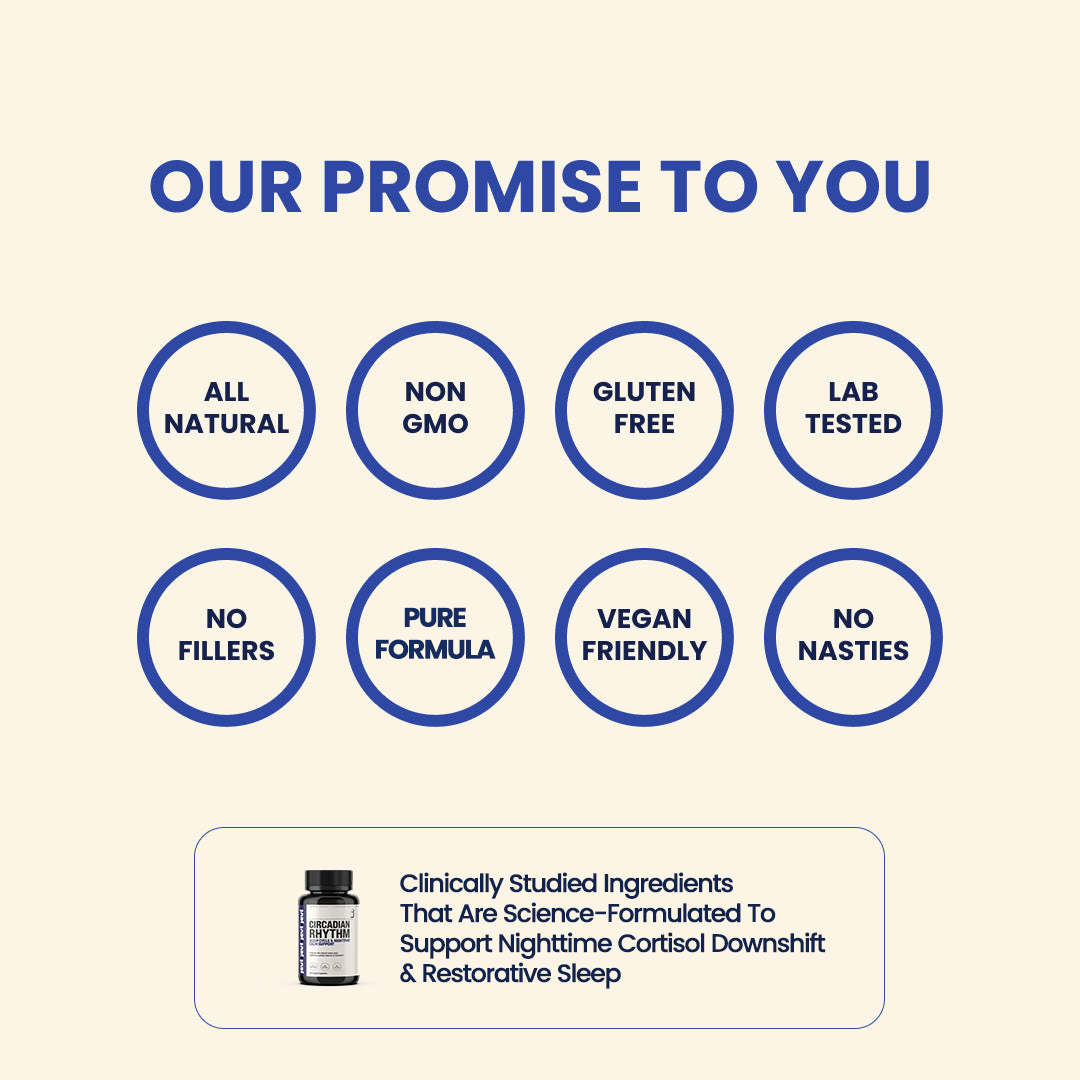 The Circadian Rhythm formula is a layered system designed to address three distinct levels of nighttime dysfunction, helping you transition from a high-alert state into restorative rest. Unlike "sledgehammer" supplements that rely on one heavy sedative, this system uses precise dosages to fix the stress chemistry that makes natural sleep impossible.